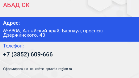 АБАД СК по адресу 656906, Алтайский край, Барнаул, проспект Дзержинского, 43 в дальнейшем Организация, размещена в следующих категориях:
