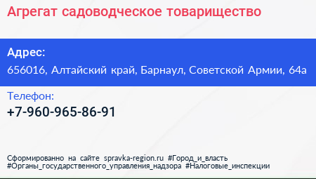 Агрегат, садоводческое товарищество по адресу 656016, Алтайский край, Барнаул, Советской Армии, 64а в дальнейшем Организация, размещена в следующих категориях: