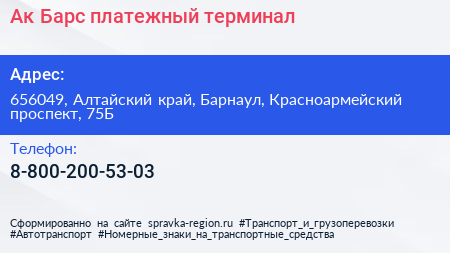 Ак Барс, платежный терминал по адресу 656049, Алтайский край, Барнаул, Красноармейский проспект, 75Б в дальнейшем Организация, размещена в следующих категориях: