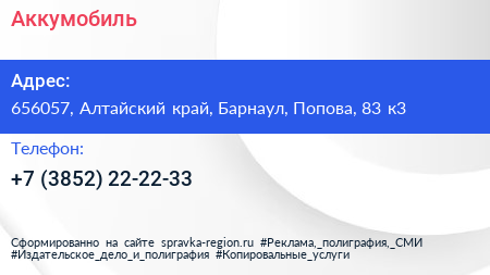 Аккумобиль по адресу 656057, Алтайский край, Барнаул, Попова, 83 к3 в дальнейшем Организация, размещена в следующих категориях: