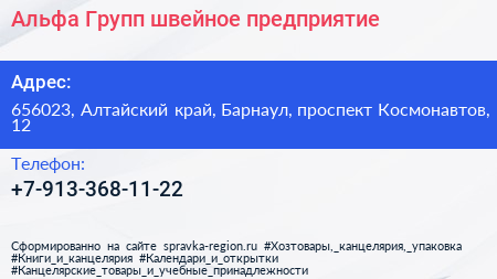 Альфа Групп, швейное предприятие по адресу 656023, Алтайский край, Барнаул, проспект Космонавтов, 12 в дальнейшем Организация, размещена в следующих категориях: