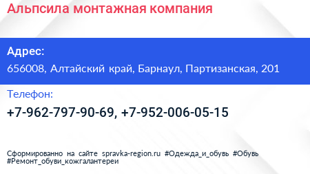 Альпсила, монтажная компания по адресу 656008, Алтайский край, Барнаул, Партизанская, 201 в дальнейшем Организация, размещена в следующих категориях: