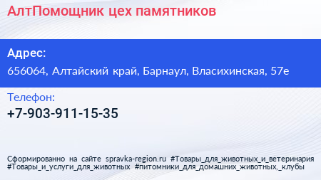 АлтПомощник, цех памятников по адресу 656064, Алтайский край, Барнаул, Власихинская, 57е в дальнейшем Организация, размещена в следующих категориях: