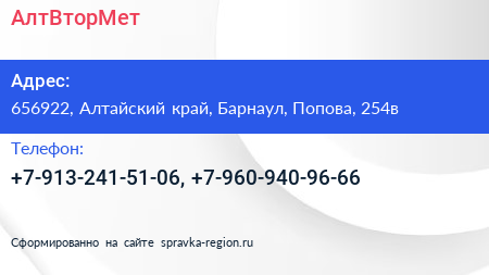 АлтВторМет по адресу 656922, Алтайский край, Барнаул, Попова, 254в в дальнейшем Организация, размещена в следующих категориях: