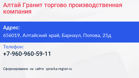 Алтай Гранит, торгово-производственная компания по адресу 656019, Алтайский край, Барнаул, Попова, 25д в дальнейшем Организация, размещена в следующих категориях: