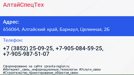 АлтайСпецТех по адресу 656064, Алтайский край, Барнаул, Целинная, 2Б в дальнейшем Организация, размещена в следующих категориях: