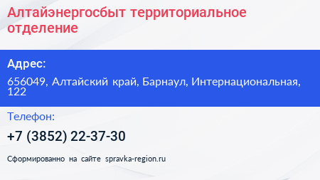 Алтайэнергосбыт, территориальное отделение по адресу 656049, Алтайский край, Барнаул, Интернациональная, 122 в дальнейшем Организация, размещена в следующих категориях: