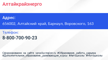 Алтайкрайэнерго по адресу 656002, Алтайский край, Барнаул, Воровского, 163 в дальнейшем Организация, размещена в следующих категориях: