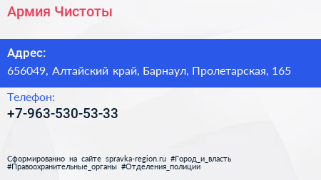 Армия Чистоты по адресу 656049, Алтайский край, Барнаул, Пролетарская, 165 в дальнейшем Организация, размещена в следующих категориях: