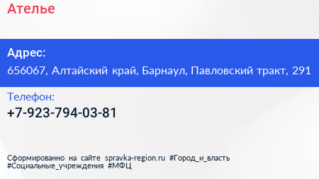 Ателье по адресу 656067, Алтайский край, Барнаул, Павловский тракт, 291 в дальнейшем Организация, размещена в следующих категориях:
