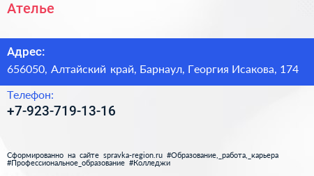 Ателье по адресу 656050, Алтайский край, Барнаул, Георгия Исакова, 174 в дальнейшем Организация, размещена в следующих категориях: