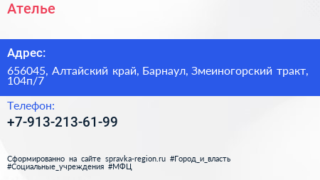 Ателье по адресу 656045, Алтайский край, Барнаул, Змеиногорский тракт, 104п/7 в дальнейшем Организация, размещена в следующих категориях: