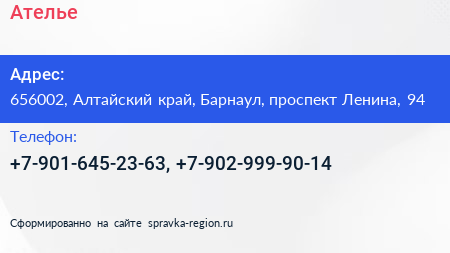 Ателье по адресу 656002, Алтайский край, Барнаул, проспект Ленина, 94 в дальнейшем Организация, размещена в следующих категориях: