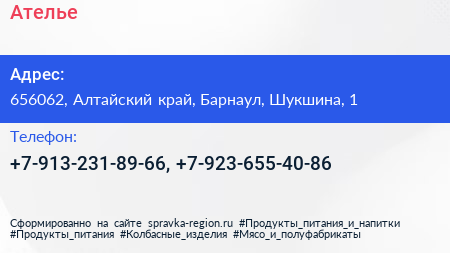 Ателье по адресу 656062, Алтайский край, Барнаул, Шукшина, 1 в дальнейшем Организация, размещена в следующих категориях: