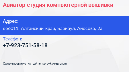 Авиатор, студия компьютерной вышивки по адресу 656011, Алтайский край, Барнаул, Аносова, 2а в дальнейшем Организация, размещена в следующих категориях: