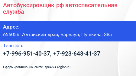 Автобуксировщик.рф, автоспасательная служба по адресу 656056, Алтайский край, Барнаул, Пушкина, 38а в дальнейшем Организация, размещена в следующих категориях: