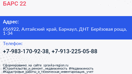 БАРС-22 по адресу 656922, Алтайский край, Барнаул, ДНТ Берёзовая роща, 1-34 в дальнейшем Организация, размещена в следующих категориях: