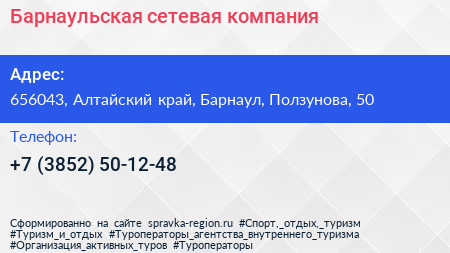 Для связи с организацией воспользуйтесь номером телефона: +7 (3852) 50-12-48. Пн: c 08:00-12:00, Вт: c 08:00-12:00, Ср: c 08:00-12:00, Чт: c 08:00-12:00, Пт: c 08:00-12:00, Сб: выходной, Вс: выходной. сервисный центр - пн-пт 8:00-17:00, вы можете обратиться в эту организацию.