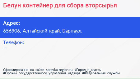 Белун, контейнер для сбора вторсырья по адресу 656906, Алтайский край, Барнаул, в дальнейшем Организация, размещена в следующих категориях: