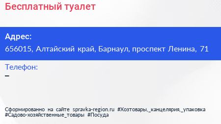 Бесплатный туалет по адресу 656015, Алтайский край, Барнаул, проспект Ленина, 71 в дальнейшем Организация, размещена в следующих категориях: