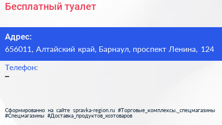 Бесплатный туалет по адресу 656011, Алтайский край, Барнаул, проспект Ленина, 124 в дальнейшем Организация, размещена в следующих категориях: