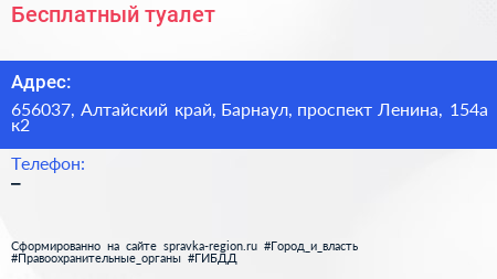 Бесплатный туалет по адресу 656037, Алтайский край, Барнаул, проспект Ленина, 154а к2 в дальнейшем Организация, размещена в следующих категориях: