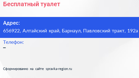 Бесплатный туалет по адресу 656922, Алтайский край, Барнаул, Павловский тракт, 192а в дальнейшем Организация, размещена в следующих категориях: