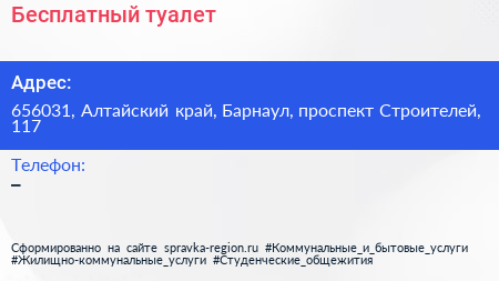 Бесплатный туалет по адресу 656031, Алтайский край, Барнаул, проспект Строителей, 117 в дальнейшем Организация, размещена в следующих категориях: