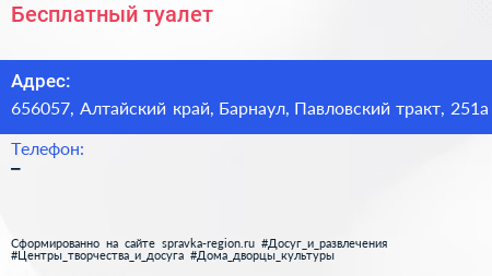 Бесплатный туалет по адресу 656057, Алтайский край, Барнаул, Павловский тракт, 251а в дальнейшем Организация, размещена в следующих категориях: