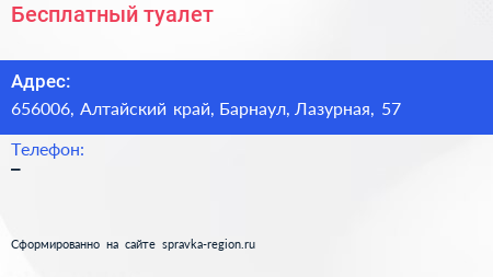 Бесплатный туалет по адресу 656006, Алтайский край, Барнаул, Лазурная, 57 в дальнейшем Организация, размещена в следующих категориях: