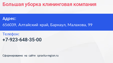 Большая уборка, клининговая компания по адресу 656039, Алтайский край, Барнаул, Малахова, 99 в дальнейшем Организация, размещена в следующих категориях: