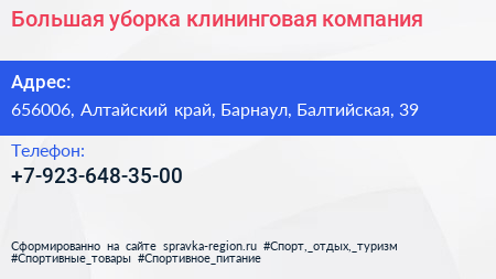 Большая уборка, клининговая компания по адресу 656006, Алтайский край, Барнаул, Балтийская, 39 в дальнейшем Организация, размещена в следующих категориях: