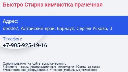 Быстро Стирка, химчистка-прачечная по адресу 656067, Алтайский край, Барнаул, Сергея Ускова, 3 в дальнейшем Организация, размещена в следующих категориях: