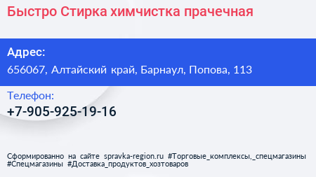 Быстро Стирка, химчистка-прачечная по адресу 656067, Алтайский край, Барнаул, Попова, 113 в дальнейшем Организация, размещена в следующих категориях: