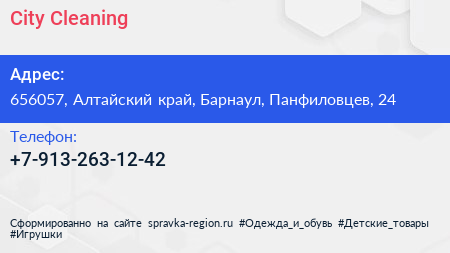 City Cleaning по адресу 656057, Алтайский край, Барнаул, Панфиловцев, 24 в дальнейшем Организация, размещена в следующих категориях: