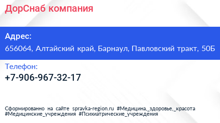 ДорСнаб, компания по адресу 656064, Алтайский край, Барнаул, Павловский тракт, 50Б в дальнейшем Организация, размещена в следующих категориях: