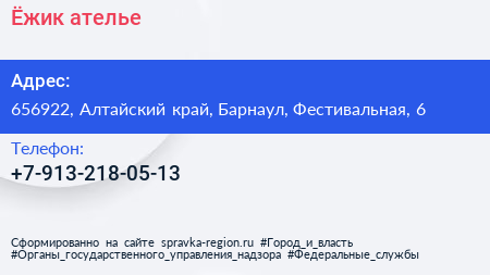 Ёжик, ателье по адресу 656922, Алтайский край, Барнаул, Фестивальная, 6 в дальнейшем Организация, размещена в следующих категориях: