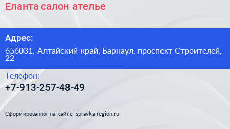 Еланта, салон-ателье по адресу 656031, Алтайский край, Барнаул, проспект Строителей, 22 в дальнейшем Организация, размещена в следующих категориях: