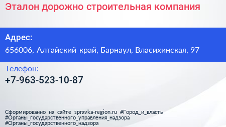 Эталон, дорожно-строительная компания по адресу 656006, Алтайский край, Барнаул, Власихинская, 97 в дальнейшем Организация, размещена в следующих категориях: