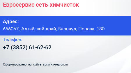 Евросервис, сеть химчисток по адресу 656067, Алтайский край, Барнаул, Попова, 180 в дальнейшем Организация, размещена в следующих категориях: