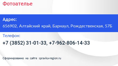 Фотоателье по адресу 656902, Алтайский край, Барнаул, Рождественская, 57Б в дальнейшем Организация, размещена в следующих категориях: