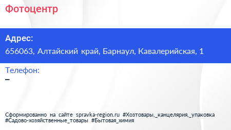 Фотоцентр по адресу 656063, Алтайский край, Барнаул, Кавалерийская, 1 в дальнейшем Организация, размещена в следующих категориях: