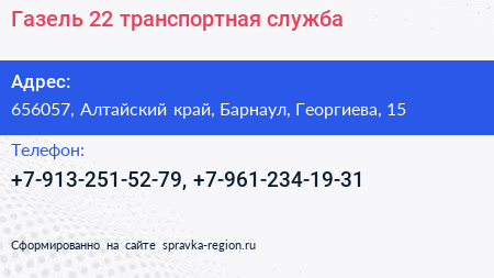 Газель 22, транспортная служба по адресу 656057, Алтайский край, Барнаул, Георгиева, 15 в дальнейшем Организация, размещена в следующих категориях: