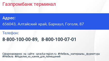 Газпромбанк, терминал по адресу 656043, Алтайский край, Барнаул, Гоголя, 87 в дальнейшем Организация, размещена в следующих категориях: