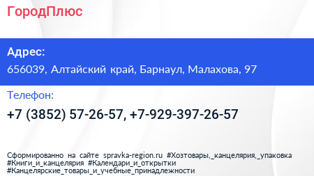 ГородПлюс по адресу 656039, Алтайский край, Барнаул, Малахова, 97 в дальнейшем Организация, размещена в следующих категориях: