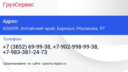 ГрузСервис по адресу 656039, Алтайский край, Барнаул, Малахова, 97 в дальнейшем Организация, размещена в следующих категориях: