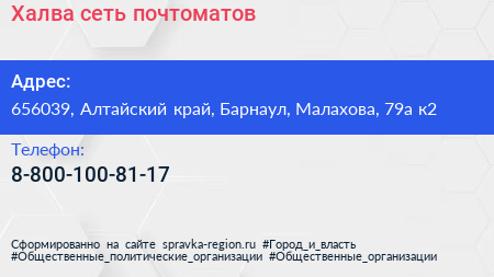Халва, сеть почтоматов по адресу 656039, Алтайский край, Барнаул, Малахова, 79а к2 в дальнейшем Организация, размещена в следующих категориях: