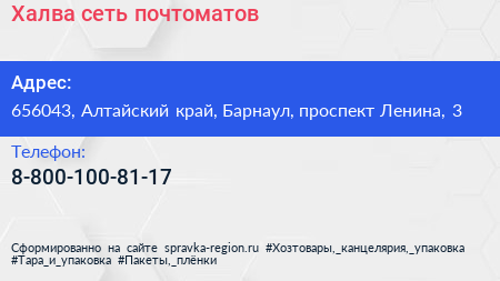 Халва, сеть почтоматов по адресу 656043, Алтайский край, Барнаул, проспект Ленина, 3 в дальнейшем Организация, размещена в следующих категориях: