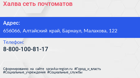 Халва, сеть почтоматов по адресу 656066, Алтайский край, Барнаул, Малахова, 122 в дальнейшем Организация, размещена в следующих категориях: