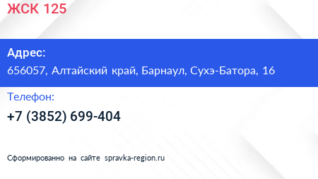 ЖСК-125 по адресу 656057, Алтайский край, Барнаул, Сухэ-Батора, 16 в дальнейшем Организация, размещена в следующих категориях: